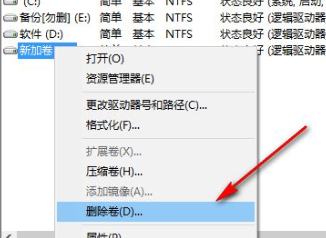 第四步:找到我们想要合并到其他磁盘的盘符,然后右键单击“删除卷”。大家要注意,删除该卷的同时,其中的文件也会被删除,所以大家最好是先将文件备份好。