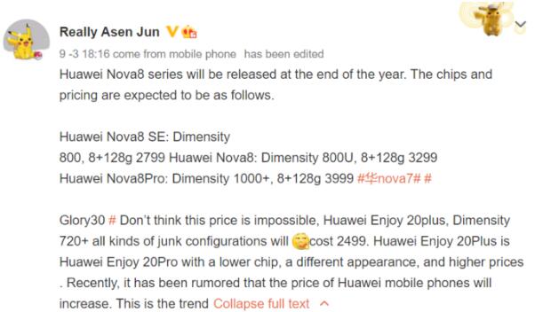 华为Nova 8可能会配备Dimensity 800U芯片组。它的8 GB RAM + 128 GB存储空间的价格为3299元(482美元)。Nova 8 Pro可能配备Dimensity 1000U芯片组。它的8 GB RAM + 128 GB存储版本的价格为3999元(585美元)。